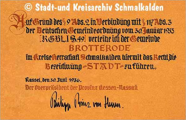 - 1936 14./ 15.11. Brotterode bekommt das Stadtrecht verliehen
